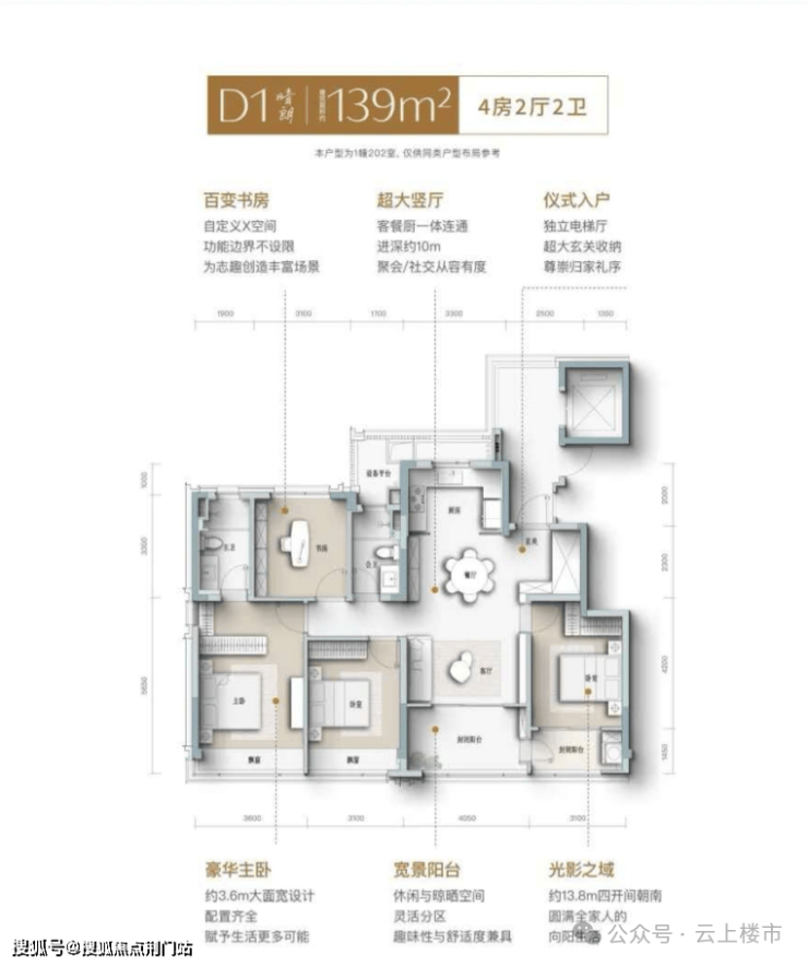 T3 大高户型则胜在 “灵动空间”,书房白天是阅读角,晚上可变童趣天地,收纳随功能切换而调整。约 13.8 米南向四开间让阳光满屋,客餐厨一体化设计进深达 10 米,聚会娱乐从容自在。主卧约 3.6 米宽敞面宽,精致衣帽间与独立卫浴俱全,满足改善家庭对 “奢享” 的需求。