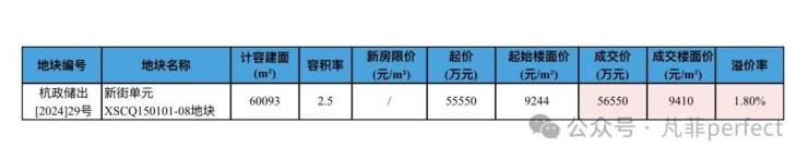 2024年4月16日,杭州光耀置业有限公司(国泰世纪)以总价56550万元竞得新街单元XSCQ150101-08地块,楼面价9410元/㎡,溢价率1.8%,不设新房限价。