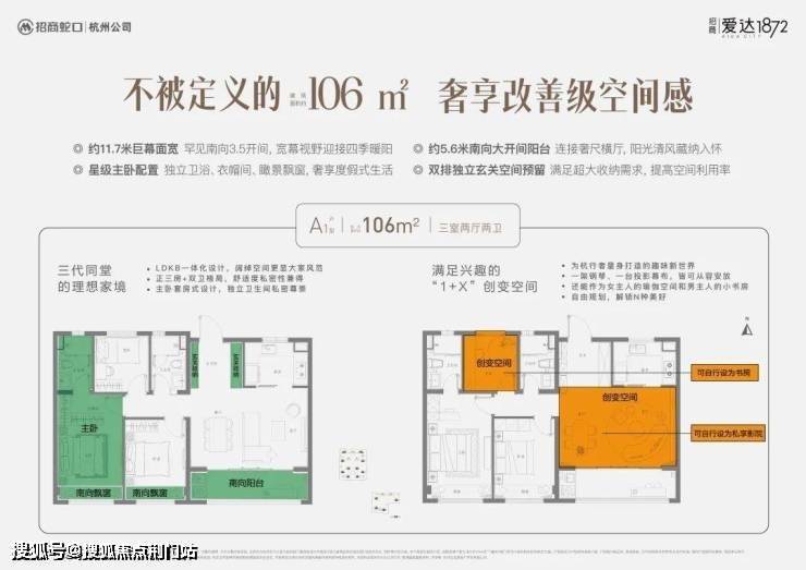 招商爱达1872让人印象深刻的, 采用非对称式立面设计,非对称式立面设计拉大了纵深,建面约106㎡四开间朝南的横厅三房,拥有“三代同堂”与“两口之家”两种创变模式。