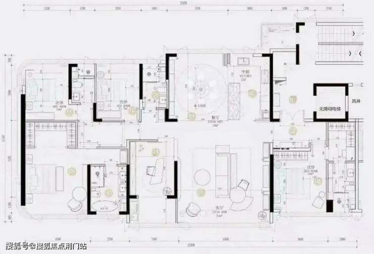 这个户型设计了4个全明卫生间,真是吊打市面上目前的许多高端改善楼盘,客厅和主卧面宽都很大,总共设计了3个大套间,户内各个空间舒适度都不错,只是不知道有人会不会介意有2个卫生间朝南。其他布置如下面,这里就不详细描述。