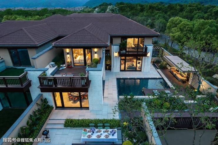 一层的平面是「曲尺型」的布局,客餐厅之间以游廊相连,客厅与餐厅以斜45°角的对望关系存在, 中间以内庭水景相隔,巧妙地解决了室内与室外之间的渗透关系。它能带给你心灵上的自由、行动上的自由,这才是真正住别墅的一种意义。