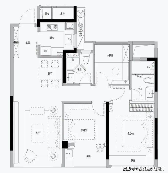 约111㎡边套:创新做到四房设计,全屏开放式餐客厅面积近30㎡,搭配大飘窗,尺度宽松 。