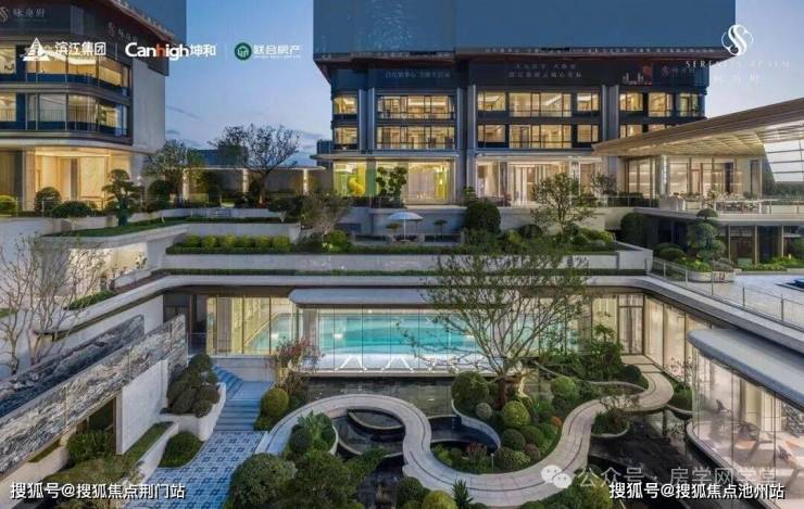 从主入口进入,约85米超宽尺度,约9.5米高鎏金大门,贵气十足。步入其中后,整个社区的景观如同立体山水画,徐徐展开。