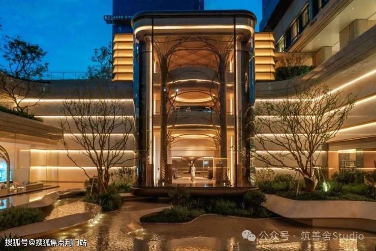 高达约14米的会所挑高大堂,四棵巨大的木纹「生机之树」顶天立地,枝桠纵横地撑起了这个三层的观景门廊。