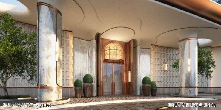 主入口设计以上海前滩华尔道夫酒店为灵感,打造尊荣归家大门,整面弧形石材景墙搭配双层金属屋檐,营造出强烈的仪式感。这种对细节的精心打磨,体现了开发团队对高品质生活的理解与追求。
