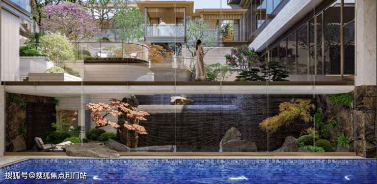 整个会所围绕落差超9米的中庭展开,蓝颂景观的宋淑华以西湖郭庄为范本,再现了“水、石、松、廊、桥、亭、轩”等经典元素,将江南韵致融入当代生活场景。