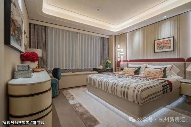 主卧套房更是整户型的点睛之笔。配备270°观景飘窗,将室内外景致最大化引入,既增强了空间的轻盈感,也提升了整体的居住品味。明卫设计进一步强化了通透与雅致并存的体验。