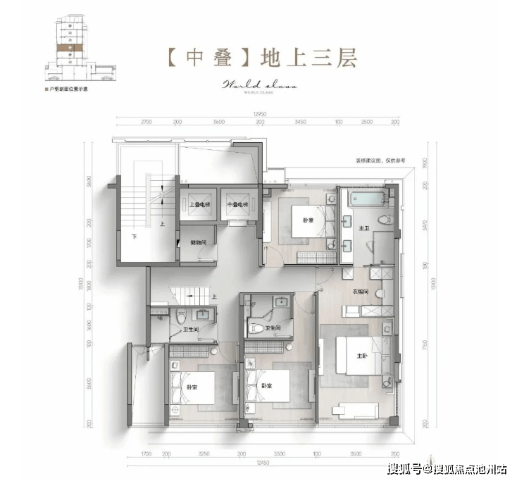 它的户型跟中下叠不一样,中下叠的格局都是居住区四个房间,包含朝南的三个套房。而上叠的居住层只有三个套房,北面是没有卧室的,取而代之的是一个步入式衣帽间。所以上叠的主卧是更加宽敞的。
