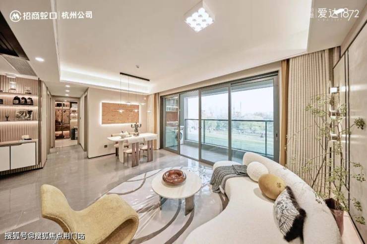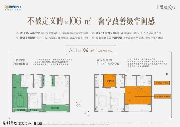 与常见的中间套户型不同,招商爱达1872的约106㎡,南向有3.5开间,面宽约有11.7米。如此一来,可以将更多南向开间面,留给餐客厅,同时外接约5.6米长的南阳台,让公区显得更为阔绰。