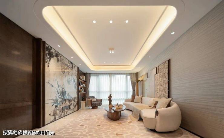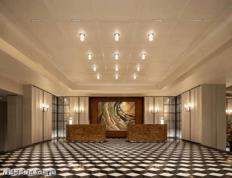 主入口吊顶借鉴古代建筑中的”藻井“元素,在形式上加以简化,运用皇家白玉石材等现代材质,方正通透,符合现代审美。