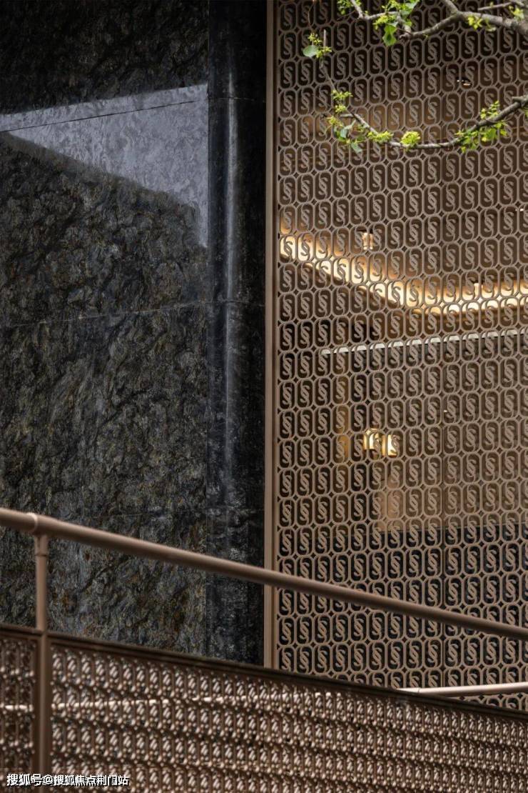 在材质的运用上,主张自然高奢主义,注重自然元素的运用与材质的混搭。将奢石、不锈钢、仿古铜等现代材质进行简化与组合,以模仿”金镶玉“的传统装饰效果,应用于整体立面设计之中,突显东方瑰丽气质。在色彩上相应的提取朱砂、琥珀、翡翠等极具东方韵味的瑰宝色系,应用于主体建筑与景观空间,呈现奢华馥郁质感。