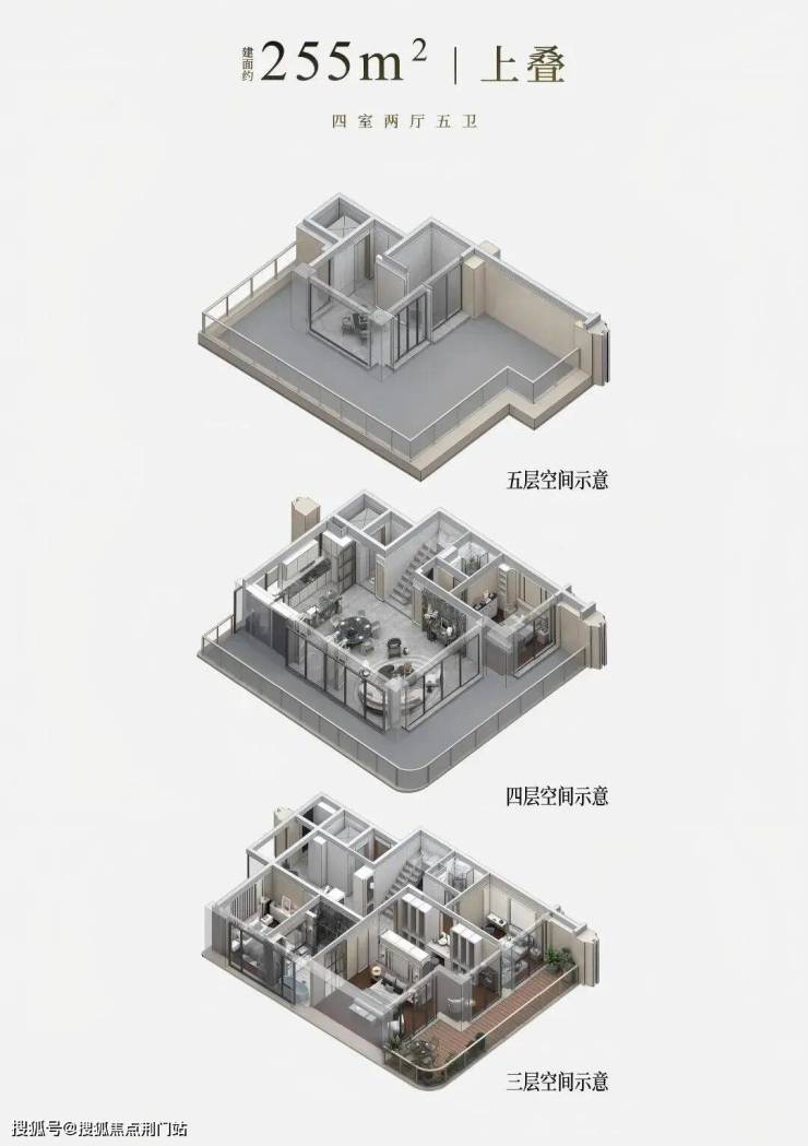 三楼卧室层的私密优雅、四楼餐客厅层的社交开阔、五楼的云端闲逸,上下之间,雍享天地,构筑一个兼具仪式感与舒适度的理想居所。这样的设置,既能实现动静分区,又能最大程度隔绝上下叠的噪音干扰,一举两得。