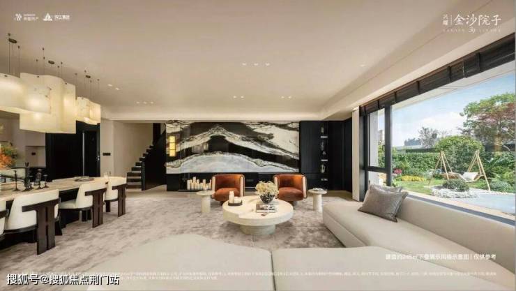 金沙院子的叠墅立面,有着艺术品般的质感。以美拉德暖色调为基调,搭配“艺术级流体无界屏”设计,凸显流线型“游艇立面”建筑美学。大面积铝板与玻璃的流动线条模糊了建筑与自然的边界,让建筑仿佛生长在大自然一般,诗意揉融,无限契合。