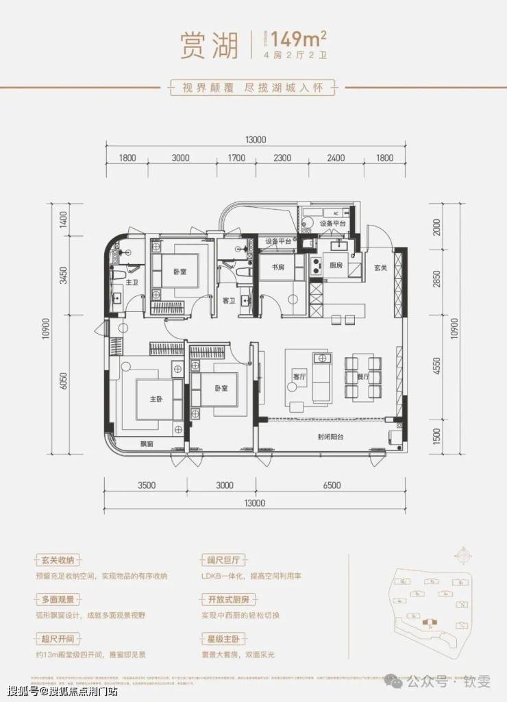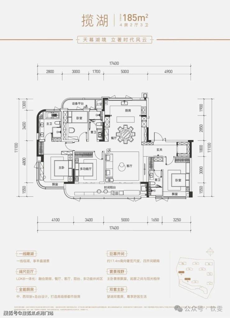 185㎡四室两厅三卫:项目最大户型,也是四房最大户型,主要分布于5#、9#两幢,一线湖景无敌视野,南向四开间面宽超17米,各功能间面积Plus,带大玄关,南向双套房设计,观景阳台面宽9.45米,面积超15方,十分奢侈,北向餐厅和厨房面积也很宽绰。