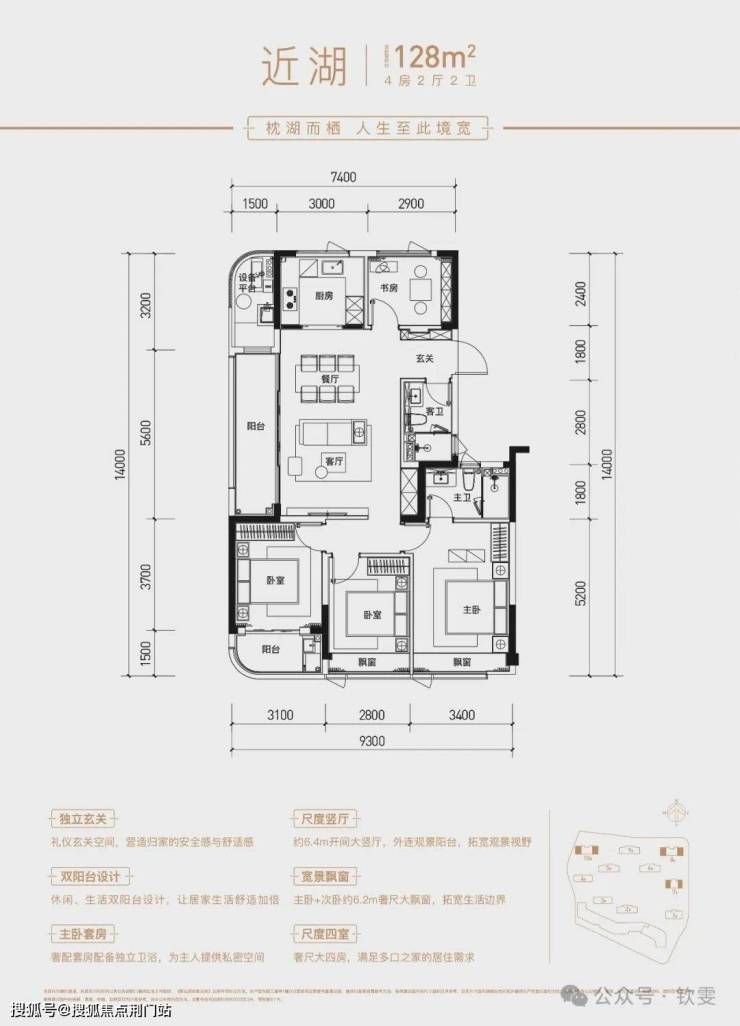128m²四房两厅两卫:主要分布在6#10#14号楼的边套户型,约6.4米开间大竖厅,连接阳台拓宽景观视野,双阳台设计,居住舒适度更高,浪费面积少,加赠送得房率在89%左右。