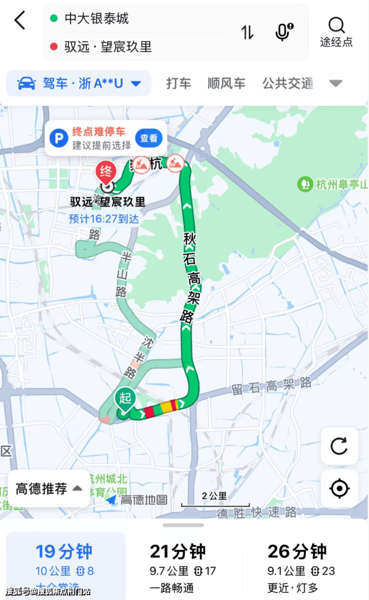 另一个小伙伴从中大银泰城出发,前往项目,在有堵车的情况下也不过只开了约19分钟,如果不堵车,导航显示只要约13分钟即可抵达。