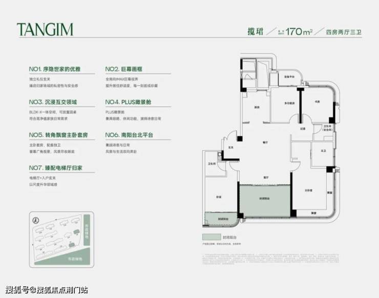 类一梯一户设计,独立玄关;类四叶草户型,空间互不干扰;南向户型整体面宽约12.7米,采光充沛;主卧270度转角飘窗,L型全景采光面;客厅阳台封闭后仍保留多阳台&设备平台,兼顾观景与实用晾晒。