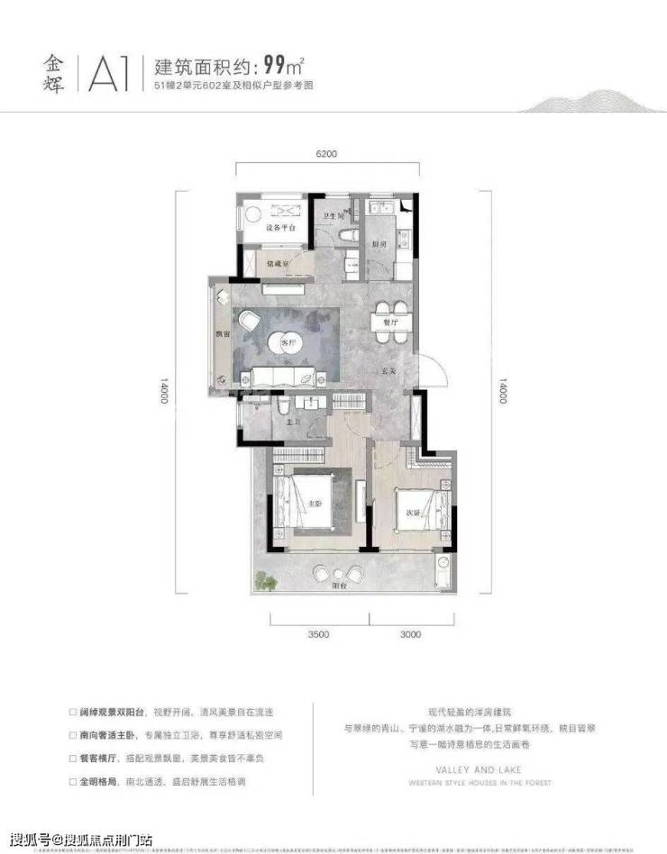 户型点评优势:双阳台设计,完美匹配湖山美景。客餐厨动线合理,观景飘窗连通了室内室外两重空间。南北通透、分区合理,尤其是储藏室的设计,十分贴心。99㎡的大两居,恰到好处地放大了各个功能区,整体看过去十分舒畅。