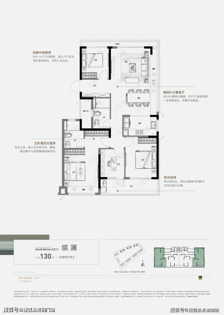 130㎡四房边厅: 270°全景飘窗:边套户型三面采光,客厅开间达6.6米,朋友聚会不憋屈;