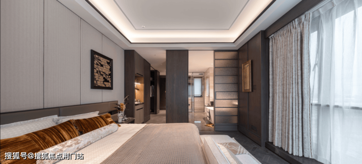 其中,主卧不仅自带270°转角窗,还设计了“洄游式”动线:开放式的梳妆区串联休息区和衣帽间,完成场景的无缝转换。