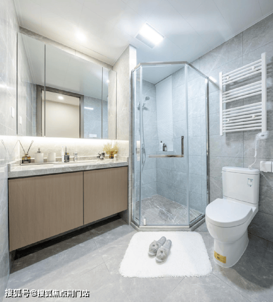 卫浴间细节也让人眼前一亮,主、次卫的镜柜,整齐收纳日化用品,预留的插座让电动牙刷、剃须刀、吹风机等电器的使用十分便捷。悉心配置的水暖电热毛巾架,随时为毛巾杀菌消毒,给予安全保障,更有人性化的科勒卫浴套装,带给家人最贴心的呵护。