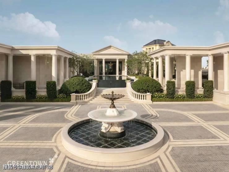 绿城·溪径恒庐做出了一条约200米的沿街界面:从楼盘大门口的喷泉广场,到沿街柱廊,一直贯通到「雅典卫城」会所。你一看这条「大门-柱廊-会所」的沿街界面就知道,这是一个价值非凡的低密楼盘。