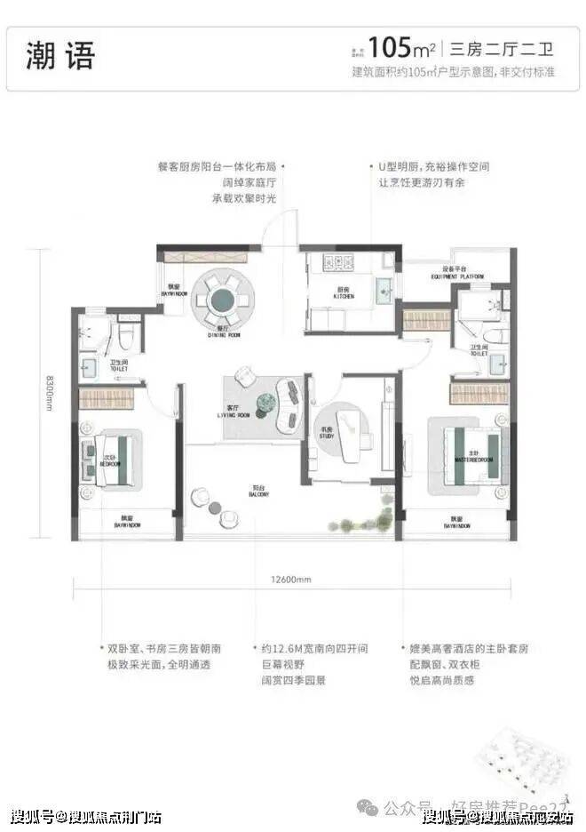 首先,项目的户型起步就是四开间朝南的建面约105方三房