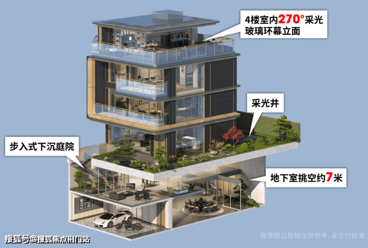 地面别出心裁的打造了“私家步入式下沉庭院”,可以直接从室外进入负一层,保证地下的采光也更优。