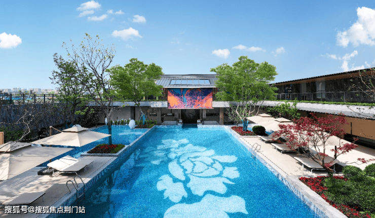 穿过大堂,眼前就是约380方的下沉式露天戏水池,分别设置标准戏水池、儿童浅水池、按摩池。沿岸设置水吧、卡座、树岛,设计融合新中式的瓦当流水,对标奢派度假酒店。