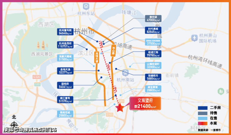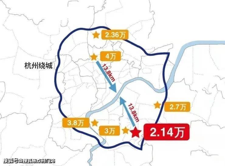 若沿着绕城看钱塘江南岸,更可以直观的看到:滨江浦乐限价38000元/㎡、南部新城核心30000元/㎡、新街27000元/㎡,21400元/㎡的所前价格优势,更是显而易见。
