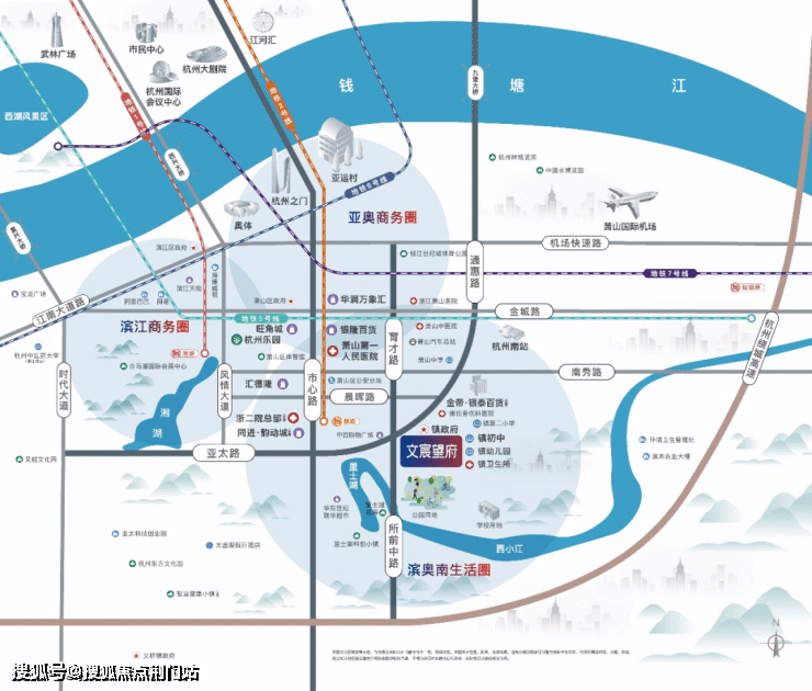 【文宸望府】择址滨奥南CLD,周边四大黄金主干道便捷畅达主城芯,坐享一站式繁华配套:项目距地铁2号线朝阳站仅约2公里(直线距离),周边市心路、通惠路、风情大道、时代大道四大黄金动脉快速链接奥体、钱江新城等中芯地段,集结金帝·银泰百货商圈(即将开业)、万象汇、恒隆、银隆等城市精华商业集群;同时步行约200米直达里士湖公园,纵享湘湖、天乐湖、杨静坞省级森林公园环绕,氤氲都市桃源秘境。