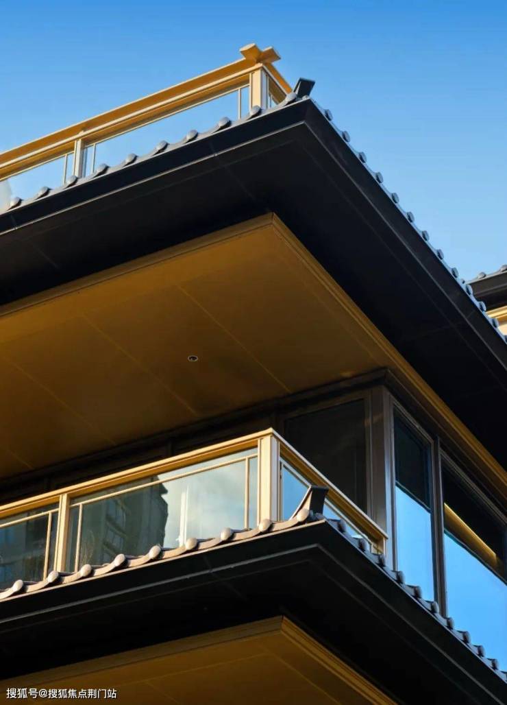 三重屋檐,代表天地人融合的东方宫殿最高等级,上檐、外檐、下檐三重结构,现代立面,以铝板、格栅、石材、瓦墙型材、玻璃等现代型材,彰显传世之宅的独特气度。摒弃早期中式建筑的白墙黑瓦,精研居住建筑的材质与色彩搭配,注重冷暖的多重对比。中式建筑的立面呈现出的不是粉墙黛瓦,而是「宋韵五色」。
