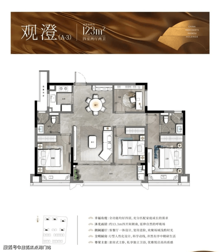 潮语臻境府的户型设计,打破了“4万+只能买刚需”的刻板印象,主力户型建面约123-168㎡四房,把“精质住宅”做到了极致。