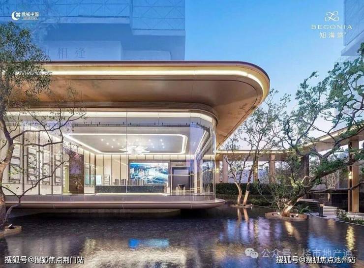 通过门廊,采用透光吊顶,通透感更强,来到归家大堂,落地玻璃外就是大片水系