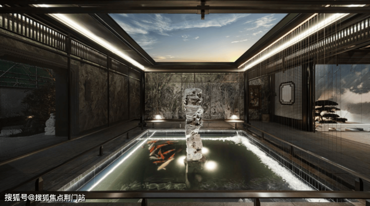 下沉式庭院中,有假山叠石、瀑布水帘,美轮美奂,氤氲着豪宅的府邸气象!