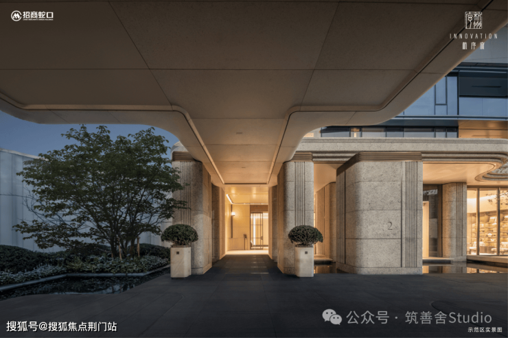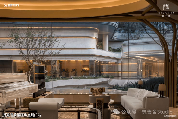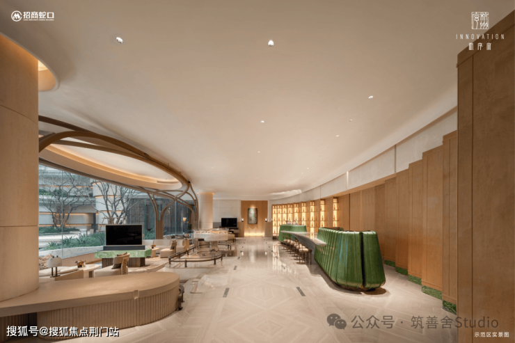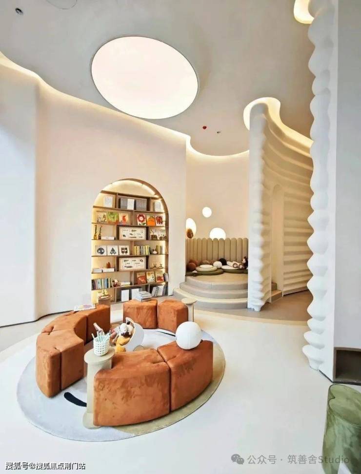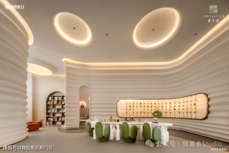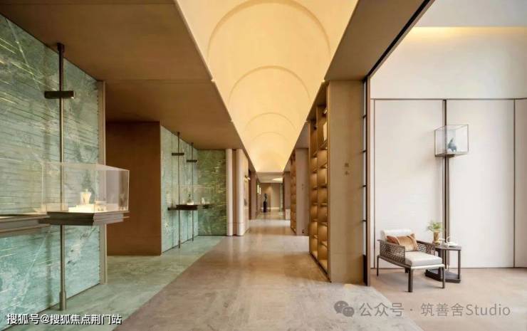 架空层精心打造,携手西泠印社,以书吧、休闲区、会议室为核心文化载体。特色拱圈长廊巧妙连接两侧空间,墙面装饰或为实用书架,或为璀璨发光的石材,亦或为营造度假气息的精致格栅,营造出多元化的空间体验。同时,注重屋顶与地面软装的和谐搭配,提升整体空间美感和舒适度。