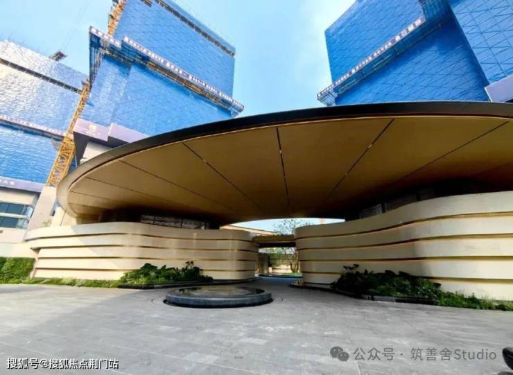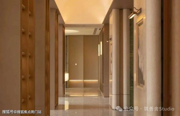 杭序府匠心独运,打造别具一格的「溪谷」门厅,一眼难忘,令人印象深刻。灵感源自九溪烟树的幽深谷景,采用曲面石材景墙搭配香槟金属线条,宛如潺潺溪水般灵动。上方矗立一座气势恢宏的扇形华盖,名为【沧浪华盖】,其错落有致的造型自然勾勒出入门的峡谷景观。流畅的宽阔弧线,起始于主入口处月光米黄的石材(主入口两重门厅的景墙,就用掉了近1000m³月光米黄石材)双曲面墙体,以其独特的气势,强势横跨整个空间。