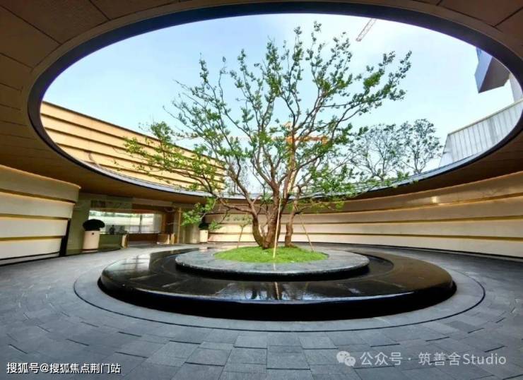 「天光云廊」的第二门厅,作为同源嘉佩乐酒店的迎宾之境,特色双悬浮水景与百年乌桕树相映成趣,精选蓝翡翠石材与安哥拉黑石材巧妙搭配,步履间,恍若穿越幽径,步入豁然开朗的桃花源境。