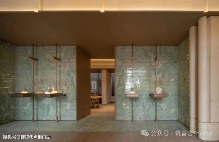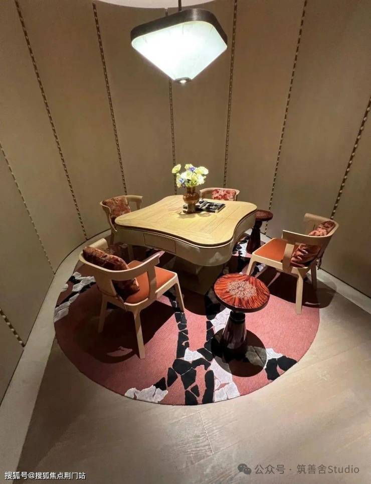 私宴,以撞色绿色石材打造的景墙巧妙划分出休憩与用餐区域,既巧妙掩盖了空间中的柱子,又破解了宽阔空间的单调感。拱券天花与墙面波浪板的和谐呼应,既彰显了空间布局的层次感,又打破了传统对称的僵化。淡雅的硬装色调搭配深邃的中古家具与软装,简约而不失格调,视觉体验清新自然,避免了过度夸张。