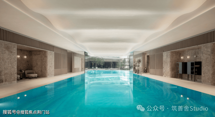 泳池设计令人赞叹不已,天花与墙面,以及泳池马赛克波浪的巧妙呼应,展现了高度的和谐统一。精选莫奈花园奢石,融入四叶草元素,搭配软装花朵沙发,泳池扶手的卷草图案尽显自然风情,令人耳目一新。该项目巧妙地将扶手打造得美观大方,实属难得。休息区巧妙设置为凹龛式,虽然实用性有待考量,但其硬装化的处理手法独树一帜。运用中古柜子替代传统硬装,为储物功能提供了全新的诠释。