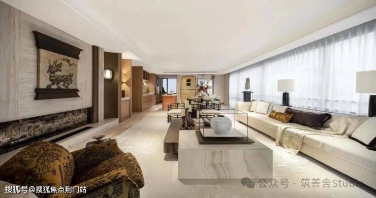 220㎡的户型在170㎡的基础上进行了全面升级,拓展了空间尺度,更显阔绰。新增了西厨岛台和洗衣房区域,功能更加完备。220㎡设计灵感源自石砚,独树一帜地采用了深色系风格。其客厅背景墙精选整块「一碧千里」石材,呈现出鲜明的肌理美感。