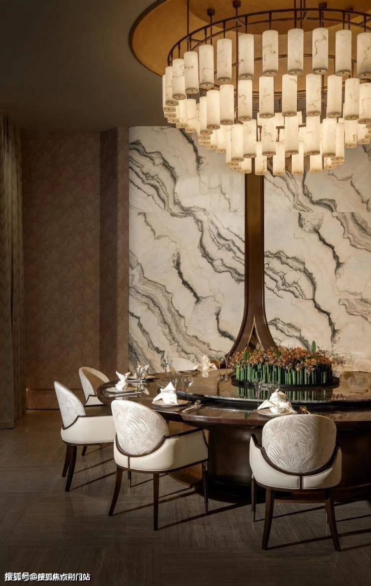 私宴空间内,云石吊灯如瀑布般倾泻而下,光影交错间,彰显出非凡的秩序之美与恢宏气度。