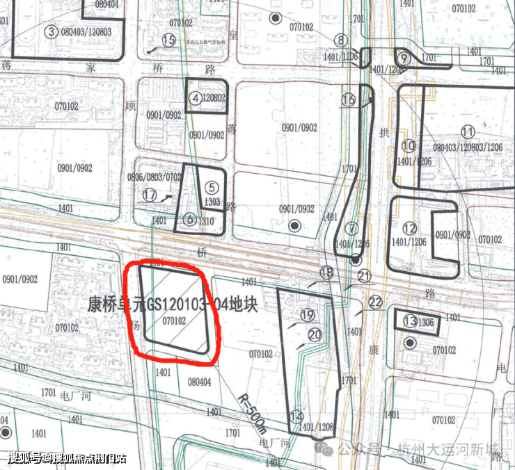 规划图还公布了地块周边500米范围内的市政设施图,地块北侧,未来规划为康良快速路,可以看到应该是地下快速路隧道口,就位于顾阳路与康桥路交叉口;
