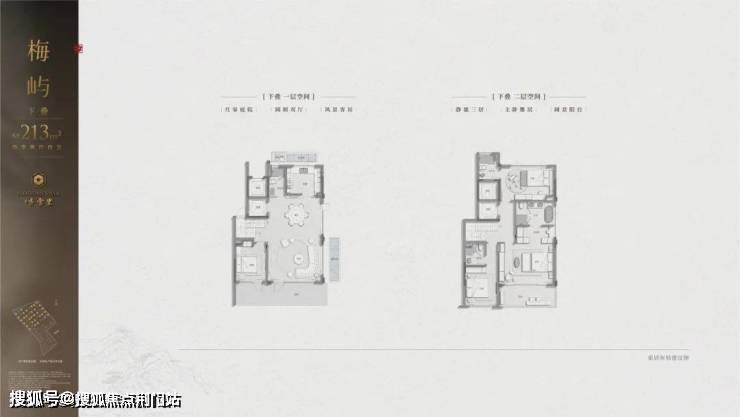 建筑立面:古今交融的诗意表达:外立面以香槟金铝板为基调,搭配蓝眼睛石材与玻璃幕墙,融合传统歇山重檐、纳福悬鱼等元素,既保留宋式建筑的对称美学,又赋予现代建筑的轻盈通透。合院组团采用三面庭院设计,L型景观面与环绕式檐廊,将超山梅影、丁山湖光引入每一扇窗景!