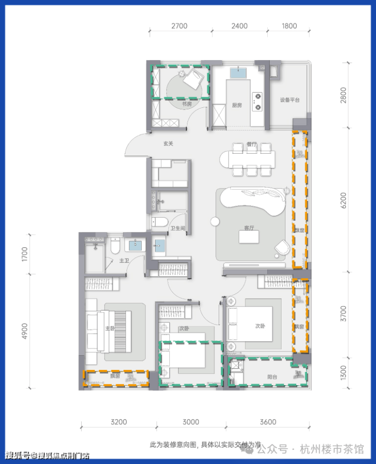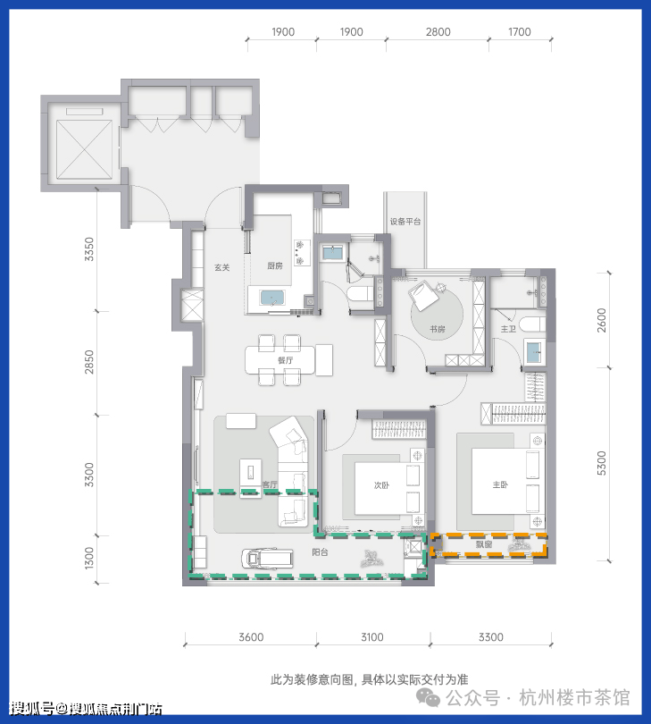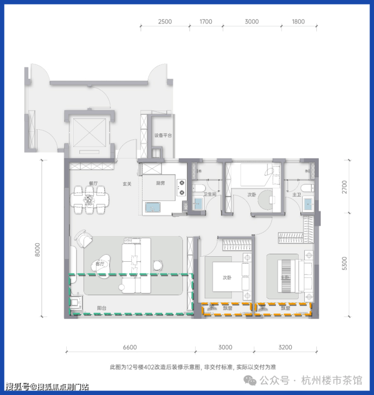 户型整体进深短,面宽大,使得套内使用率大幅提升,客餐厅与北次卧部分阳台包进室内,卧室区270度转角飘窗,包括主卫及廊道都做了侧飘窗,从南侧双卧一直延伸到主卫,形成了画廊式观景视野,合计面宽约15米。值得一提的是北侧的设备平台,后期可以做适当改造利用。