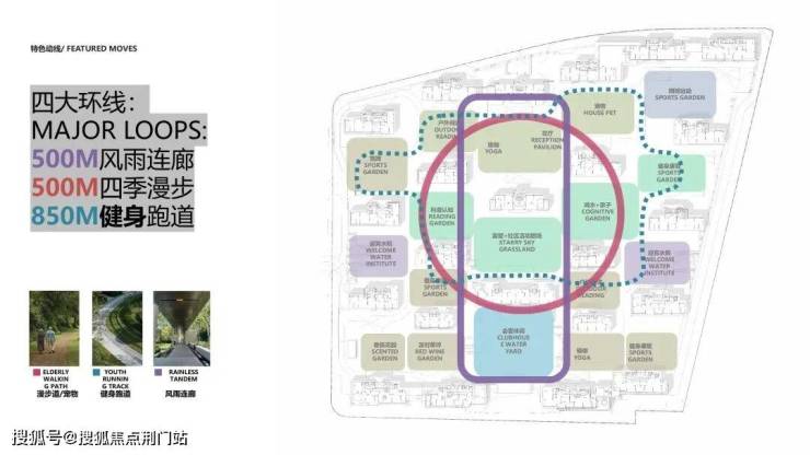 再叠加一圈约850米长的慢跑道,在风雨连廊和风景步道之间,大致呈东西向串连。