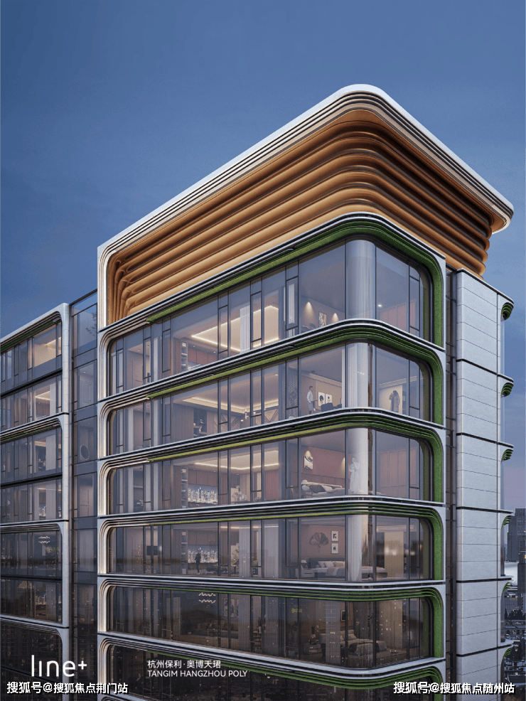 保利·奥博天珺的建筑外立面,依然是非常杭州的表达。镶嵌在繁复线条中的绿色陶板,用造价昂贵的曲线,刻画出了龙井春芽的神韵。