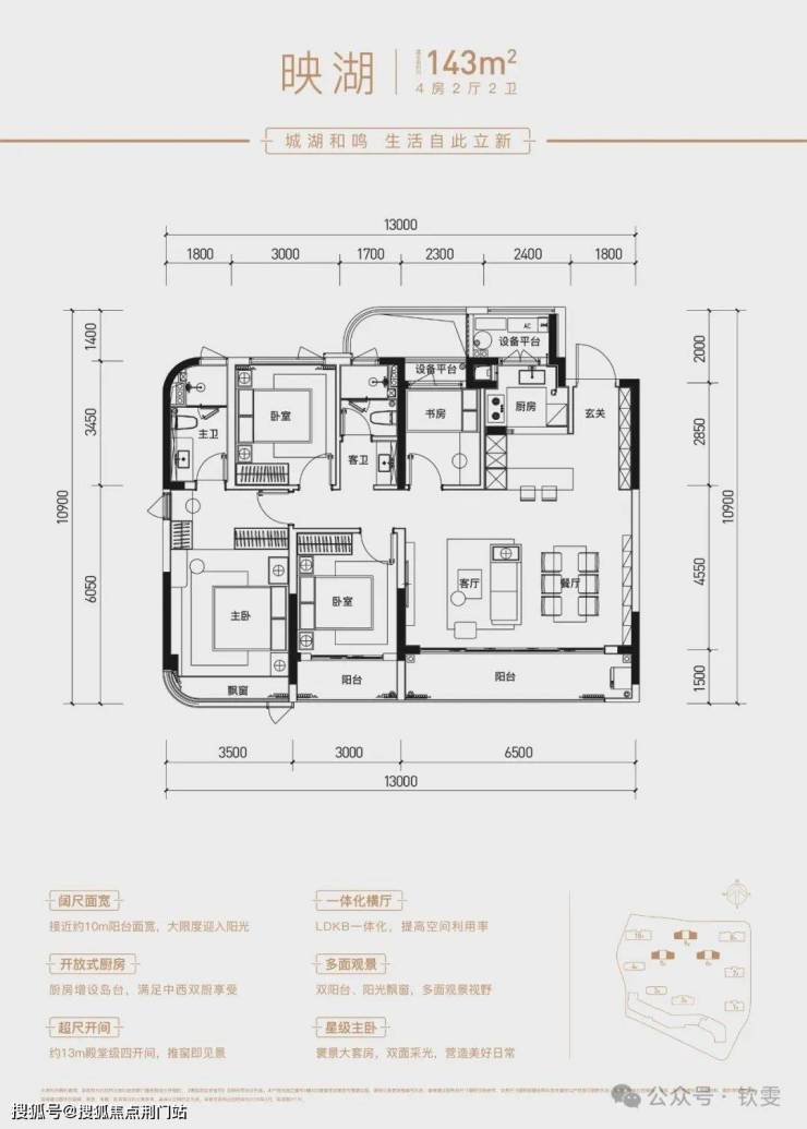 143m²四房两厅两卫:主要分布在7#8#12号楼的边套户型,位于小区中心位置,享受完整的景观资源,南向13米左右面宽,大尺度迎入阳光,中西双厨加餐客厅LDK一体化空间约40平,提高空间利用率,享受大尺度生活空间。