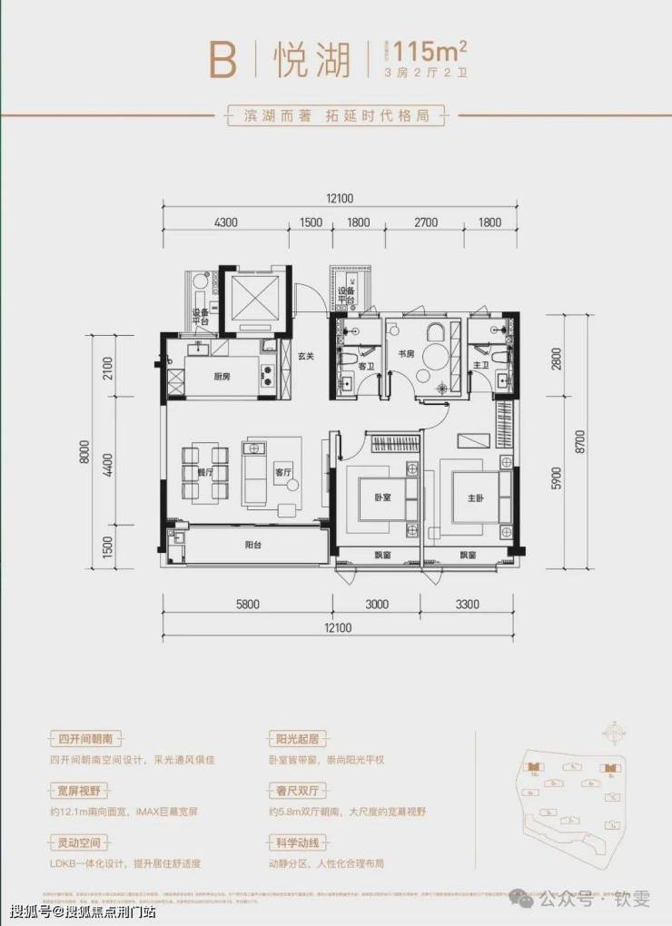 115㎡B三室两厅两卫:项目起步户型,主要分布于10#14#中间套,南向三开间面宽超12米,两房朝南,主卧套房设计,南向阳台面宽5.8米;