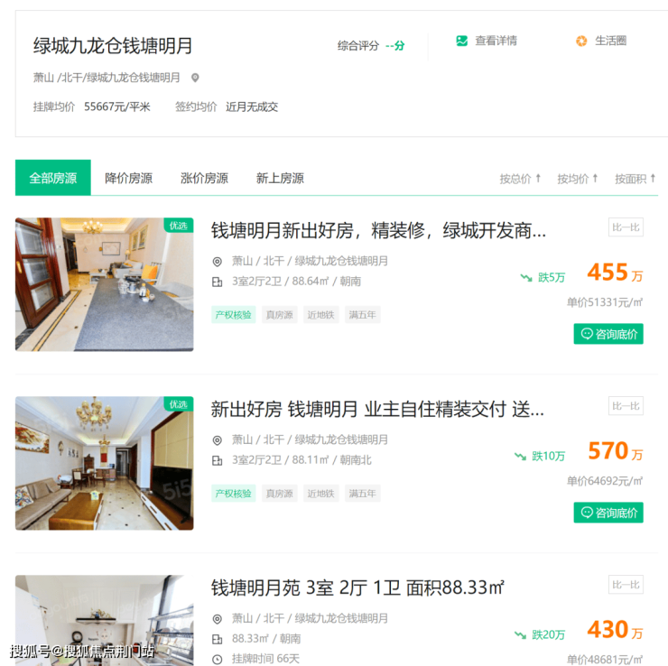 >>>隔壁的绿城九龙仓钱塘明月二手挂牌均价约5.56万/平。